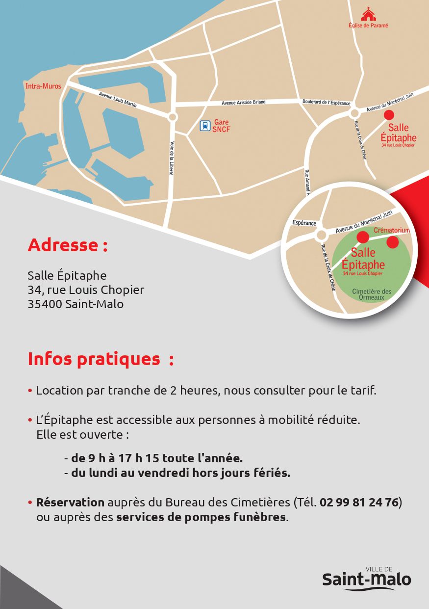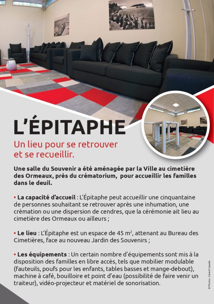 Située au cimetière des Ormeaux la salle l’Épitaphe est à la disposition des familles qui souhaitent s’y recueillir (capacité de 50 personnes).