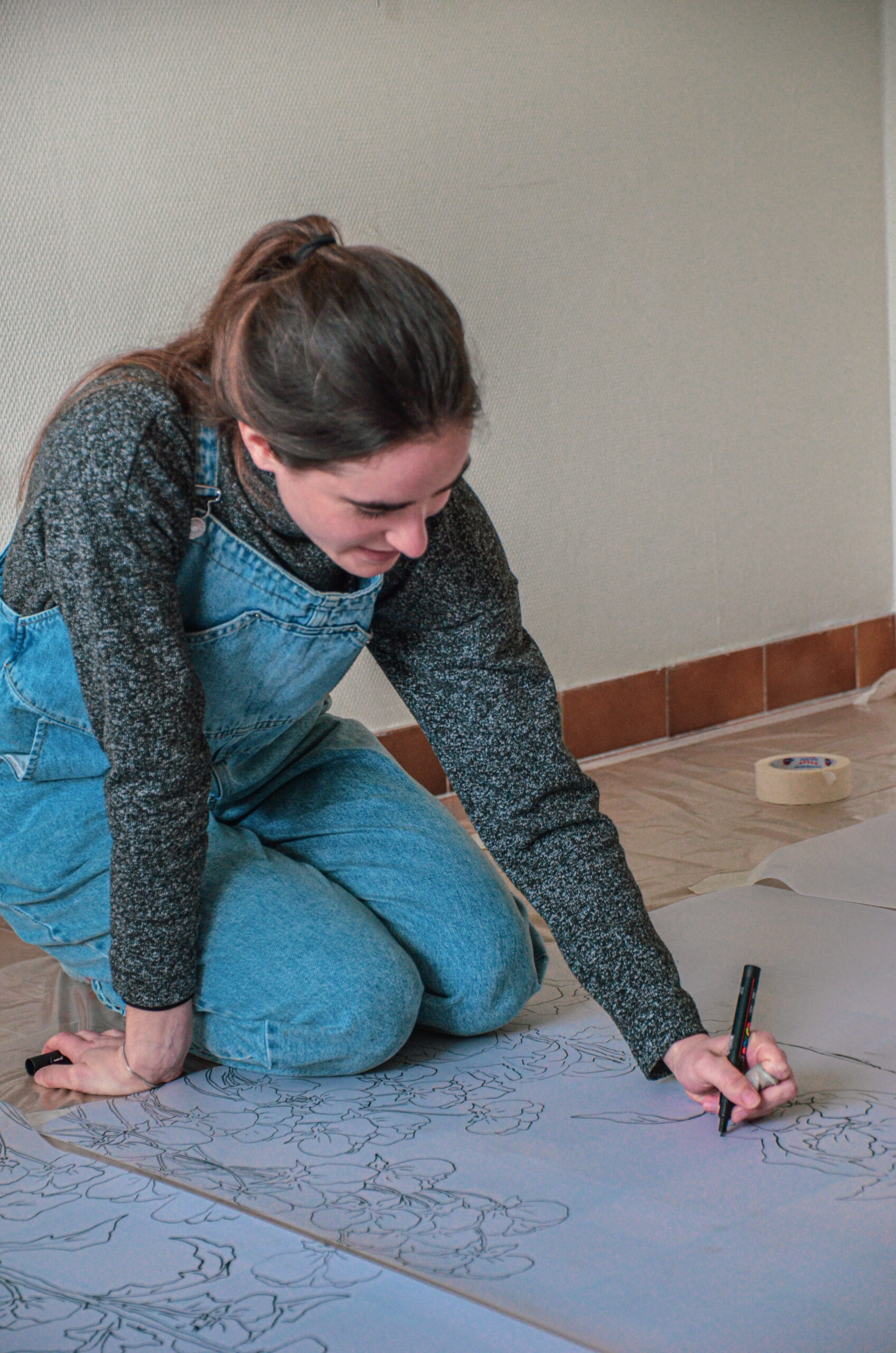 Diplômée des Beaux-Arts de Lyon, elle travaille le grand format et l’installation monumentale. Attirée par le détail du motif végétal, elle réalise ses œuvres sur différents formats et supports : papier japonais, toile, mais aussi un papier de type “calque” qui laisse pénétrer la lumière et dont elle gardera précieusement le secret. Elle travaille l’encre de chine au doigt, et sort ainsi le végétal de son milieu naturel : la couleur.